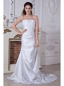 Luxurious A-line Strapless Chapel Train Satin Ruch Wedding Dress