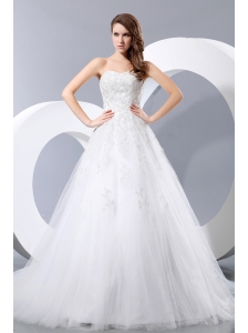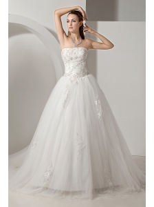 Lovely Wedding Dress A-line Strapless Appliques Chapel Train Tulle
