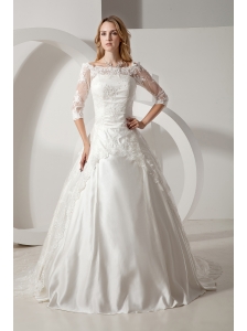 Perfect A-line Bateau Wedding Dress Chapel Train Taffeta and Lace