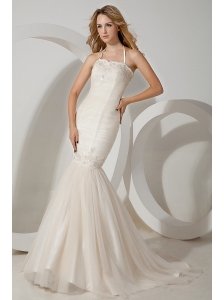 Sexy Wedding Dress Mermaid Halter Appliques Brush Train Tulle
