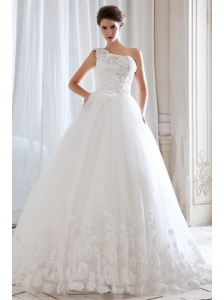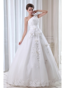 Roamntic A-line One Shoulder Wedding Dress Beading and Appliques Floor-length Tulle