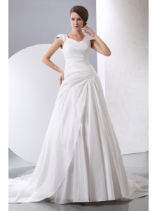 Simple A-line V-neck Ruch Wedding Dress Chapel Train Taffeta
