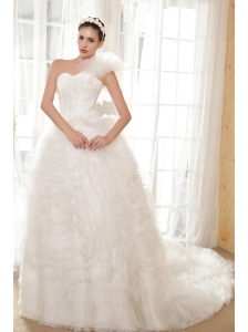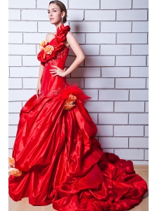 Fashionbale A-line One Shoulder Chapel Train Taffeta and Tulle Beading Wedding Dress