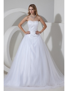 Beautiful A-line Strapless Cathedral Train Tulle Beading Wedding Dress