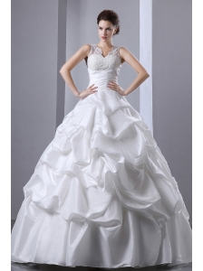 Elegant A-line V-neck Ruch and Appliques Pick-ups Wedding Dress Floor-length Taffeta