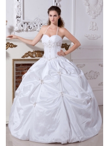 White Ball Gown Halter Embroidery Quinceanera Dess Floor-length Taffeta
