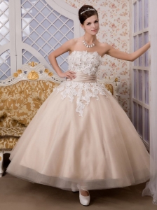 Champagne A-Line / Princess Strapless Ankle-length Appliques Tulle Wedding Dress
