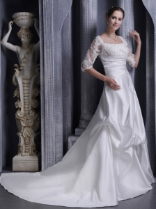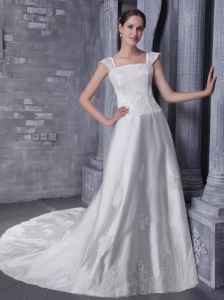 Affordable A-line Square Chaple Elastic Wove Satin Lace Wedding Dress