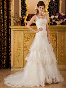 Elegant A-line / Princess Straps Court Train Tulle Lace and Beading Wedding Dress