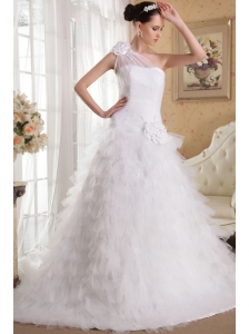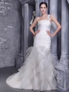 Elegant Mermaid One Shoulder Court Train Organza Ruch Wedding Dress
