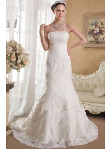 Luxurious Mermaid Strapless Chapel Train Lace Beading Wedding Dress