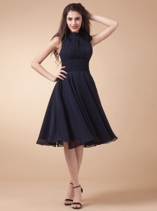 High-neck and Ruched Bodice For Custom Made Navy Blue Prom Dress