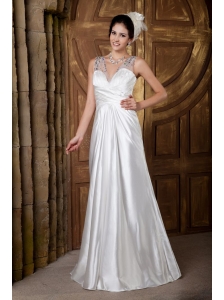 Elegant White Prom Dress For 2013 V-neck Beaded Decorate Bust Chiffon Brush Train Gown