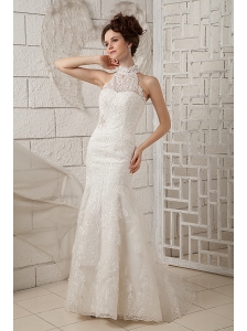 Customize Mermaid Wedding Dress High-neck Brush Train Lace Appliques