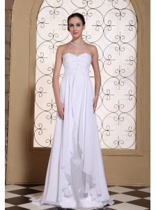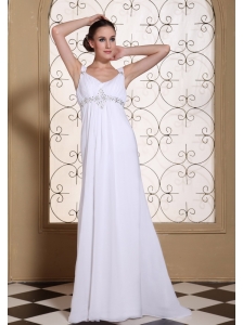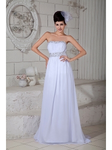 White Empire Wedding Dress Strapless Brush Train Chiffon Beading