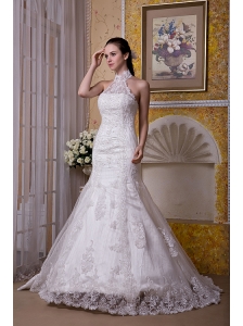 Custom Made Mermaid Halter Wedding Dress Taffeta and Lace Brush Train