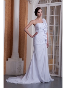 Pretty Column One Shoulder Wedding Dress Hand Made Flower Brush Train Chiffon