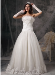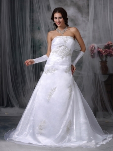 Beautiful A-line Strapless Low Cost Wedding Dress Organza Appliques Court Train