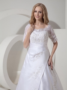 Custom Made A-line Scoop Low Cost Wedding Dress Satin Lace Chapel Train