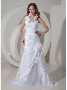 Customize A-line Halter Wedding Dress Taffeta Hand Made Flowers Court Train