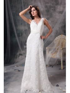 White Column V-neck Lace Wedding Dress Belt Brush Train