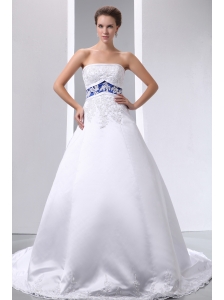 Graceful A-line Strapless Appliques Wedding Dress Brush Train Satin and Lace