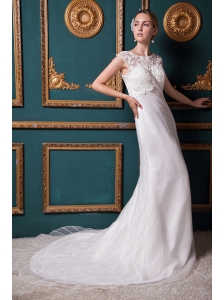 Beautiful Column Scoop Chapel Train Organza Lace Wedding Dress