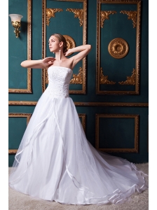 Lovely A-line Strapless Chapel Train Organza Beading Wedding Dress