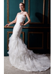 Popular Mermaid Strapless Court Train Organza Ruch Wedding Dress