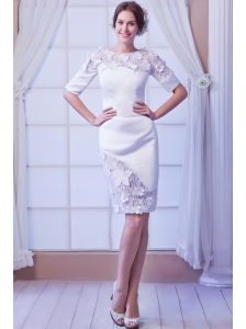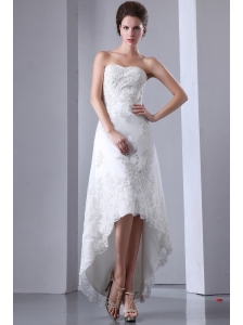 Sexy Column Strapless Short Wedding Dress High-low Elastic Wove Satin and Lace