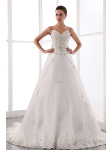 Gorgeous Wedding Dress A-line Spaghetti Straps Beading Court Train Satin and Lace