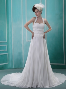 Pretty Beaded Halter Pleat Prom Dress With Chapel Train For Custom Made