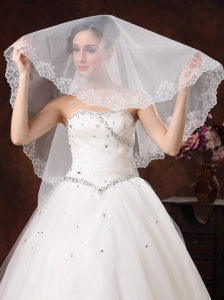 White Lace Appliques And Two-tier Organza Veil For Modest Wedding