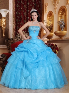 Lovely Baby Blue Quinceanera Dress Strapless Organza Appliques Ball Gown