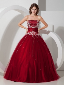 Wine Red Quinceanera Dress Strapless Satin and Tulle Appliques and Beading