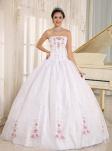 Pretty White Quinceanera Dress Strapless Appliques Satin and Organza Ball Gown