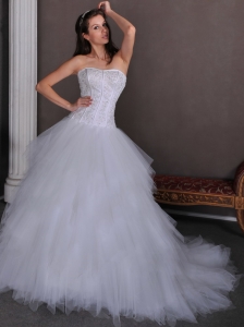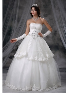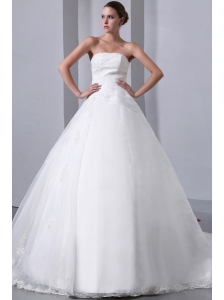 Elegant A-line Strapless Appliques Ball Gown Wedding Dress Chapel Train Satin and Tulle