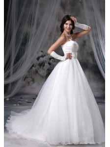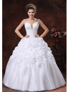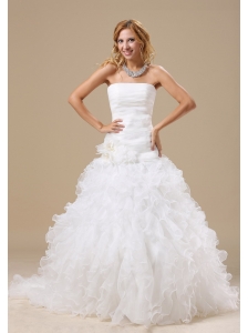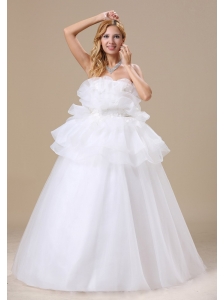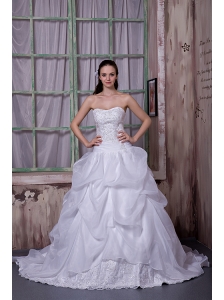 White Ball Gown Sweetheart Wedding Dress Hand Made Flowers Brush Train Organza