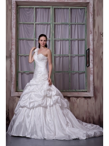 Luxurious A-line One Shoulder Wedding Dress Taffeta Appliques and Pick-ups Court Train