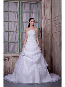 Beautiful A-line Strapless Appliques Wedding Dress Chapel Train Satin and Organza