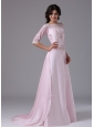 This light pink strapless wedding dress features a scoop neckline bodice with half sleeves in chic lace fabric that is fully embellished with intricate embroidery. The style of the dress is simple yet elegant. The floor length skirt flows beautifully with a lovely sweeping train that pools in a pond of fabric. You can't miss it. Take it home now!