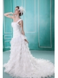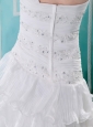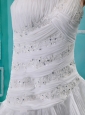Be the belle in your special day! This one shoulder fabulous wedding gown has the ruched and beaded bodice throught-out. The exquisite appliques feature the fitted bodice. The floor-length ruffled lagered skirt sways freely and creats a charming effect. The court train and the zipper up back complete the look.