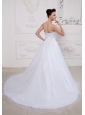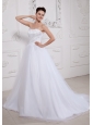 If you're determined to make a lasting impression on the most important day of your life, try this gorgeous wedding dress! The feminine profile starts from a strapless sweetheart neckline trimmed by shimmering crystals. Well pleated bust and delicate appliques in the bodice add more grace for you. The flared, floor-length skirt with a dramatic court train bring a wonderful look. Hidden zipper up back complete the look and a row of cute buttons add a final touch of elegance to an already stunning gown.