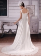 Look gorgeous for your walk up the aisle in this unique bridals wedding gown. This dress feathers with foral adorned wide straps which forms a square neckline. Exquisite hand flowers trims the straight, strapless neckline, and the long train on the back graces the fitted bodice. The corset style bodice is finished with a zipper up tie back.