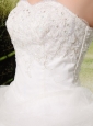 Create your own modern day fairy tale in this stunning white wedding dress! It features a modest sweetheart and exquisite embroidery wrapping the bust. Flirty layers of organza ruffles start form the dropped waist to create a luxury skirt for this eye-catching dress hemmed with lace. A lace up corset style closure in the back secures the dress in place.
