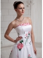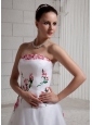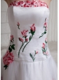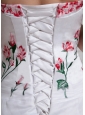 Do you want the wedding dress has some Chinese emements in it? This A-line wedding gown carries the feature. This one features a lovely strapless bodice with stunning colorful floral embroiderys throughout. The floor-length skirt has a court train. A lace up corset style closure in the back secures the dress in place.