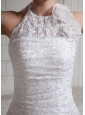 Three words come to mind to describe this dress: simple, flirty and fabulous. It features a halter bodice with lovely lace fabric and exquisite floral embellishments. The mermaid style is an example of high end couture fashion. A big beautiful hand made flower adds the interest and charm. The simple zipper up and a brush train complete the stunning wedding dress.