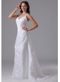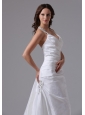 This modest white wedding dress is simple yet never fade next to other bride when you wear it! The structured bodice is accented with a beaded applique halter top forming a V-ceck and stretching one strap in the mid of the back. The A-line skirt with a brush train is highlighted with the taffeta fabric adorned with a flora applique on one side that makes the dress outstanding. The back features a zipper up closure that ensures a perfect fit. You will be the most beautiful brides in this world in this wedding dress!