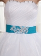 I can find no words to descride this white wedding gown except the words gorgeous, fun, and fabulous. The strapless bodice is accented with beads hemed bustline and exquisite ruchings throughout above the shining waistband, while the floor length skirt is embellished with large and glamorous rose decorations, which can attract the public. A zipper up and lovely bowknot beautify the back. You will be the spotlight in any occasion you attend.
