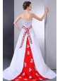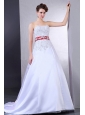 Star in your own fairytale at wedding in this wonderful wedding dress. This dress features a strapless bodice and a-line skirt with court train. The embroidery on the bodice upgrades your tastes and beautifies the dress. The red waist band is the highlight of this dress which is echoed by the back view of the dress. The hidden zipper up back secures the dress in place.